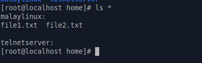 • Command ls * bermaksud untuk memaparkan direktori beserta kandungan di dalam direktori tersebut. seperti gambar di atas direktori adalah malaylinux dan terdapat fail di dalam direktori malaylinux tersebut manakala di dalam direktori telnet di mempunyai sebarang kandungan.