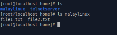• Selepas menaip command ls .. ia akan memaparkan kandungan direktori home iaitu malaylinux dan telnetserver.